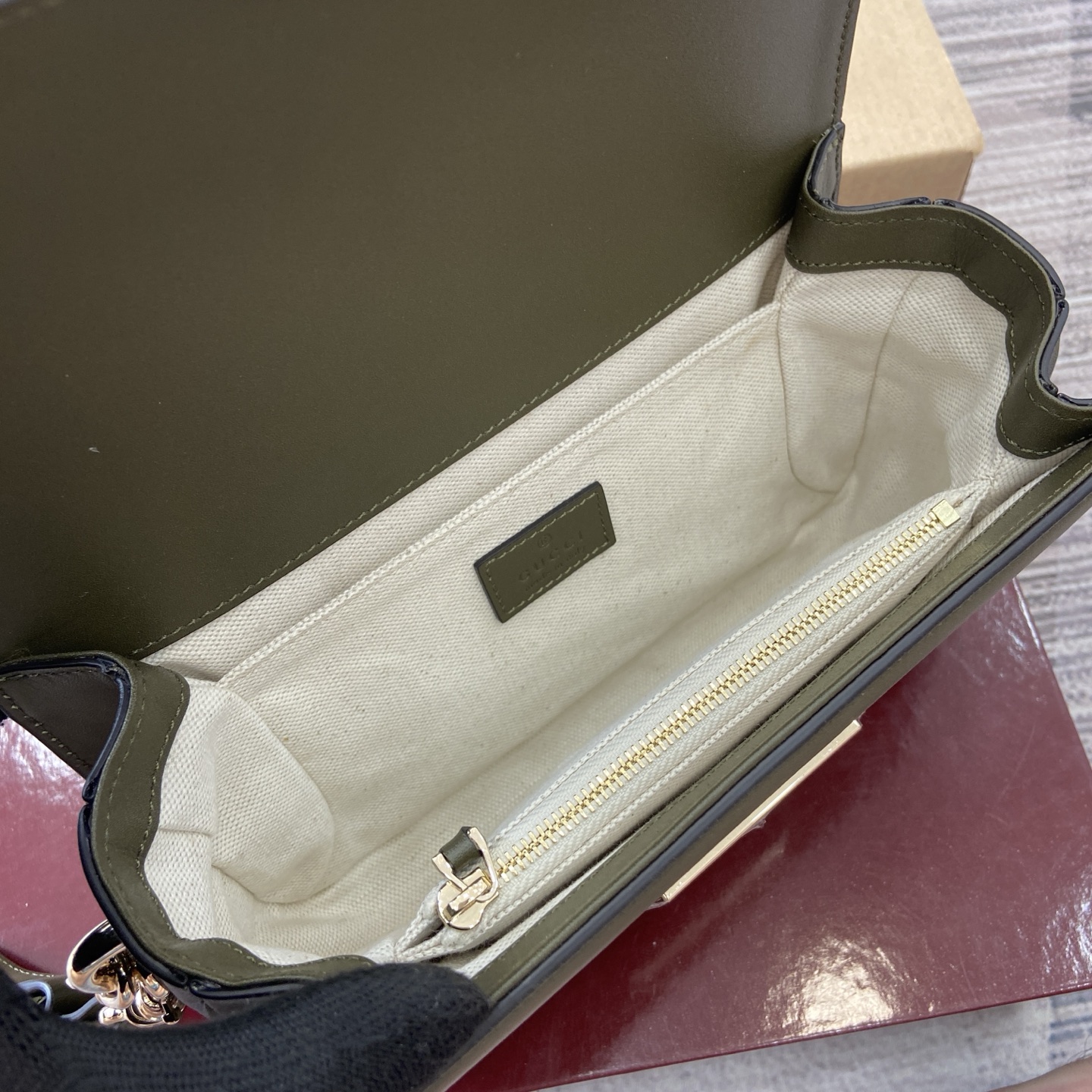 Light gold-toned hardware Beige cotton linen lining Inside: 3 main compartments, 1 zip pocket Outside: detachable mirror on the back 8.3″ chain strap drop; detachable, adjustable shoulder strap with 10.6″ drop; Length: 25.2″-40.6″ Spring closure 8.5″W x 5.5″H x 3.5″D Weight: 0.8kg, approximately